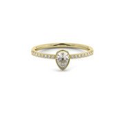 Crafted in yellow gold, white gold, and rose gold, this refined ring features a high-quality pear-cut diamond securely held in a bezel setting. The slender band, adorned with pavé-set diamonds, enhances its brilliance while ensuring durability and a comfortable fit.