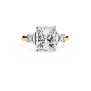 The Celestial Majesty Ring is expertly crafted with a 14K two-tone gold band, combining the rich warmth of Yellow Gold with the sleek elegance of White Gold for a striking contrast. At its center, a radiant-cut diamond shines with unmatched brilliance, its precise faceting enhancing light reflection for maximum sparkle. The centerpiece is flanked by step-cut trapezoid diamonds, renowned for their geometric symmetry and refined clarity, adding depth and sophistication to the design. Meticulously set in a secure prong setting, this ring ensures durability while maintaining its ethereal beauty, making it a timeless heirloom piece.