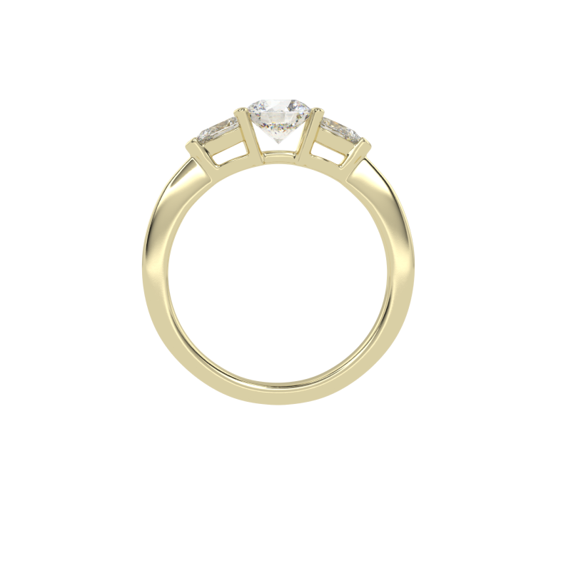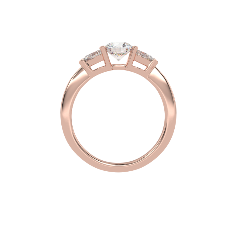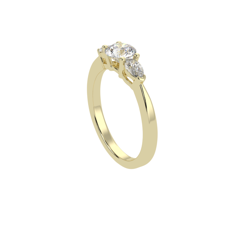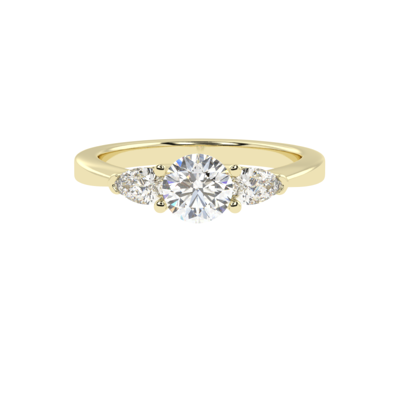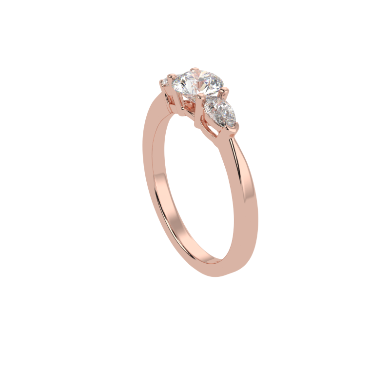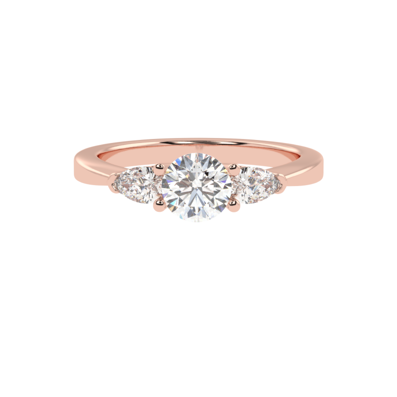 The Eternal Glow ring is expertly crafted in 14K gold, ensuring both durability and luxury. It is available in Rose Gold, White Gold, and Yellow Gold, allowing for a personalized touch to suit different styles. The ring features a round-cut center diamond and two pear-cut side diamonds, set in a secure prong setting that enhances their brilliance. The polished gold band complements the diamonds beautifully, offering a seamless blend of strength and elegance.