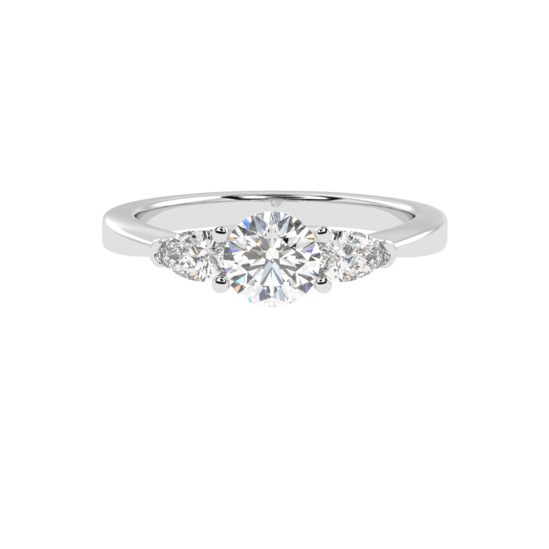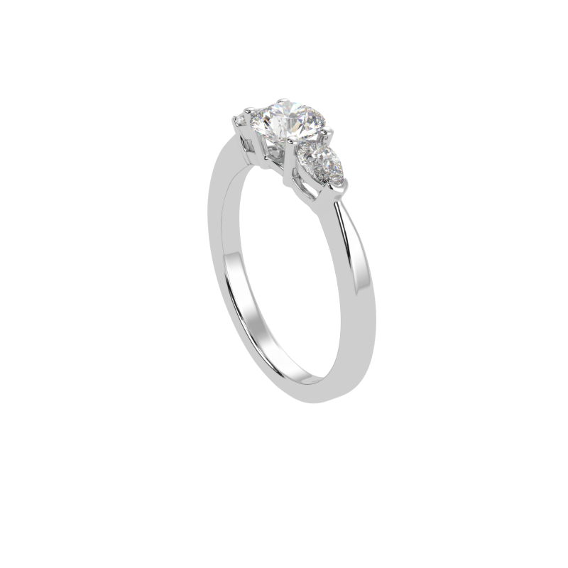 The Eternal Glow ring is a breathtaking piece that symbolizes love, commitment, and the journey shared between two souls. Featuring a brilliant round-cut diamond at the center, flanked by two pear-shaped diamonds, this ring captures the essence of timeless elegance. The delicate balance between sparkle and sophistication makes it a perfect choice for engagements, anniversaries, or as a cherished heirloom.