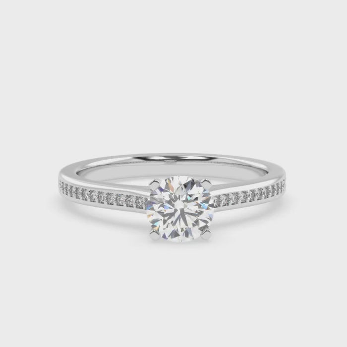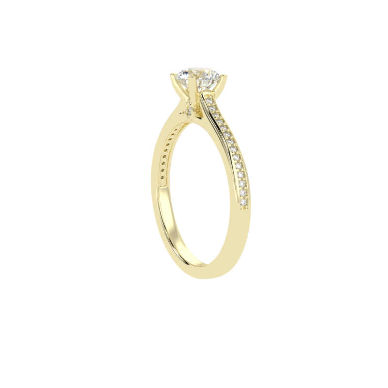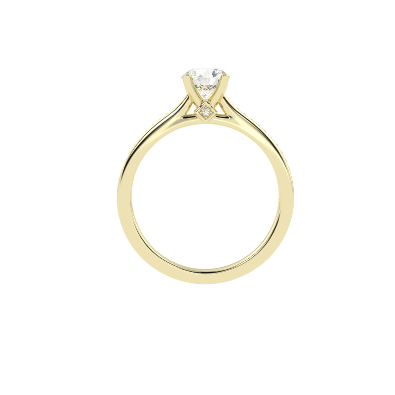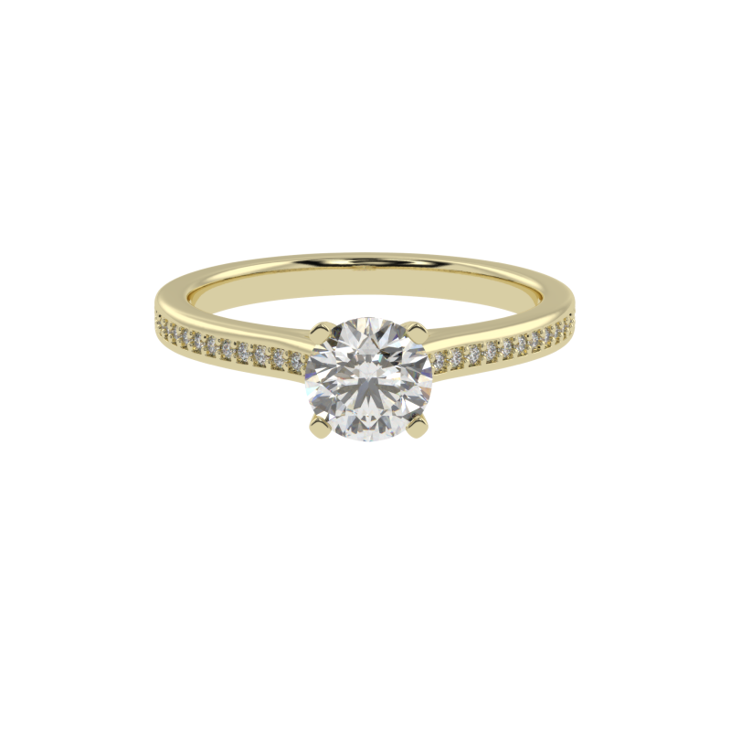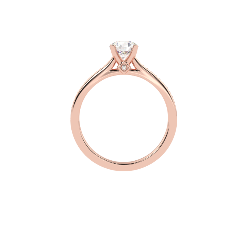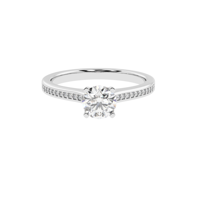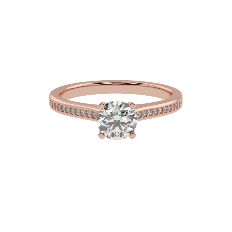 The Radiant Bloom ring is a breathtaking fusion of elegance and brilliance. Its stunning round-cut center diamond is secured by four gracefully designed prongs, while the split-shank band, adorned with shimmering pavé-set diamonds, adds a modern yet timeless touch. This design symbolizes love that flourishes and grows, making it a perfect choice for those seeking a ring that radiates both passion and sophistication.