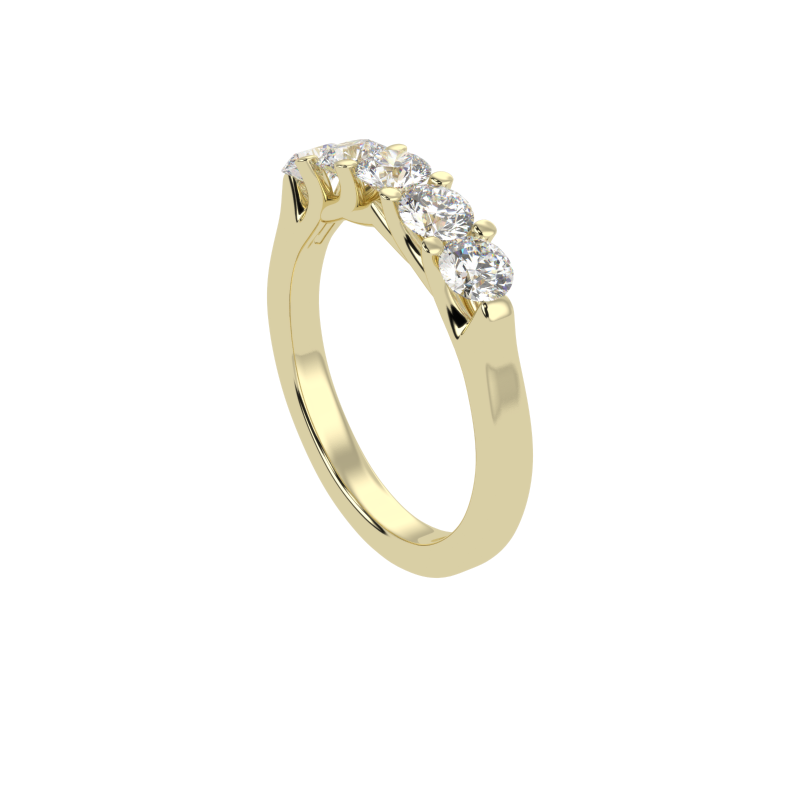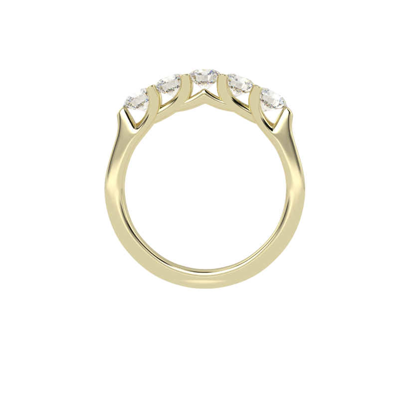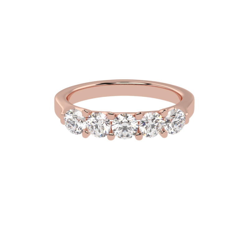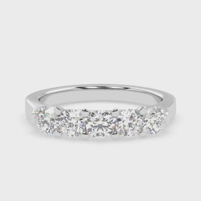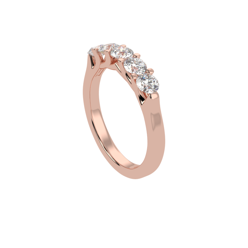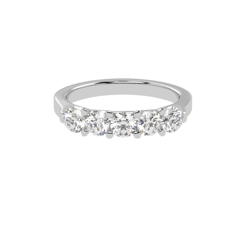 The Eterna Five ring is a stunning representation of timeless love and unwavering commitment. Featuring a dazzling row of five perfectly matched round-cut diamonds, this design radiates brilliance and balance. The minimalist yet sophisticated setting allows each diamond to shine independently while coming together in perfect harmony, making this ring an exquisite symbol of unity and elegance.